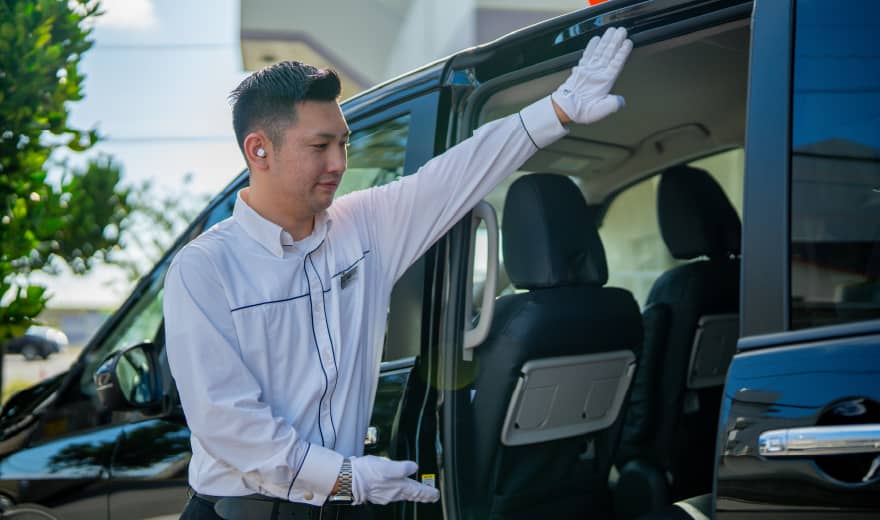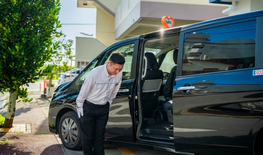ホテル1階にMKタクシーの営業所があり、前日までのご予約でホテル前から乗車できます。1日観光貸切、ゴルフ送迎、リゾートエリアへの移動に便利で、全車ミニバンタイプのためゆったり乗車でき、車椅子もそのまま乗車可能です。