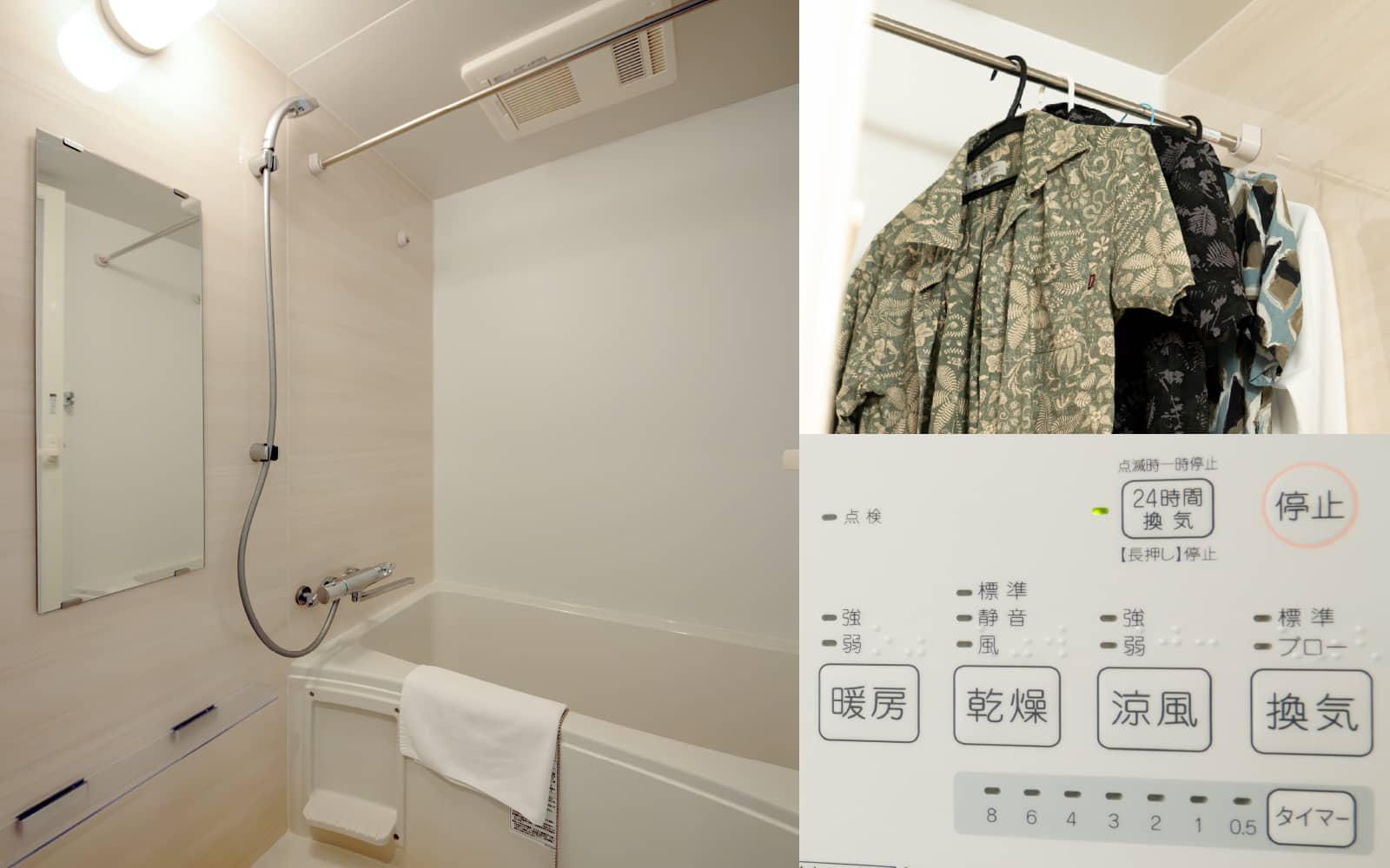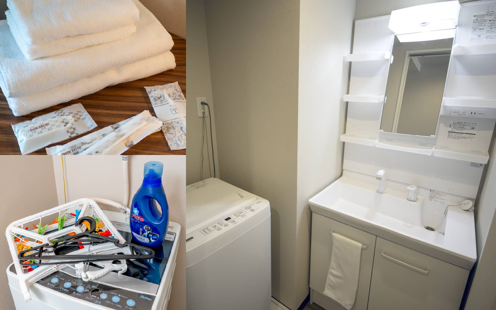 テレビ、Wi-Fi、湯沸かしポット、冷蔵庫、ドライヤー、洗浄機付トイレ、ボディーソープ、シャンプー、コンディショナー、ハミガキセット、タオル&バスタオル、スリッパ、電子レンジ、ミニキッチン、洗濯機、乾燥機、キッチンセット